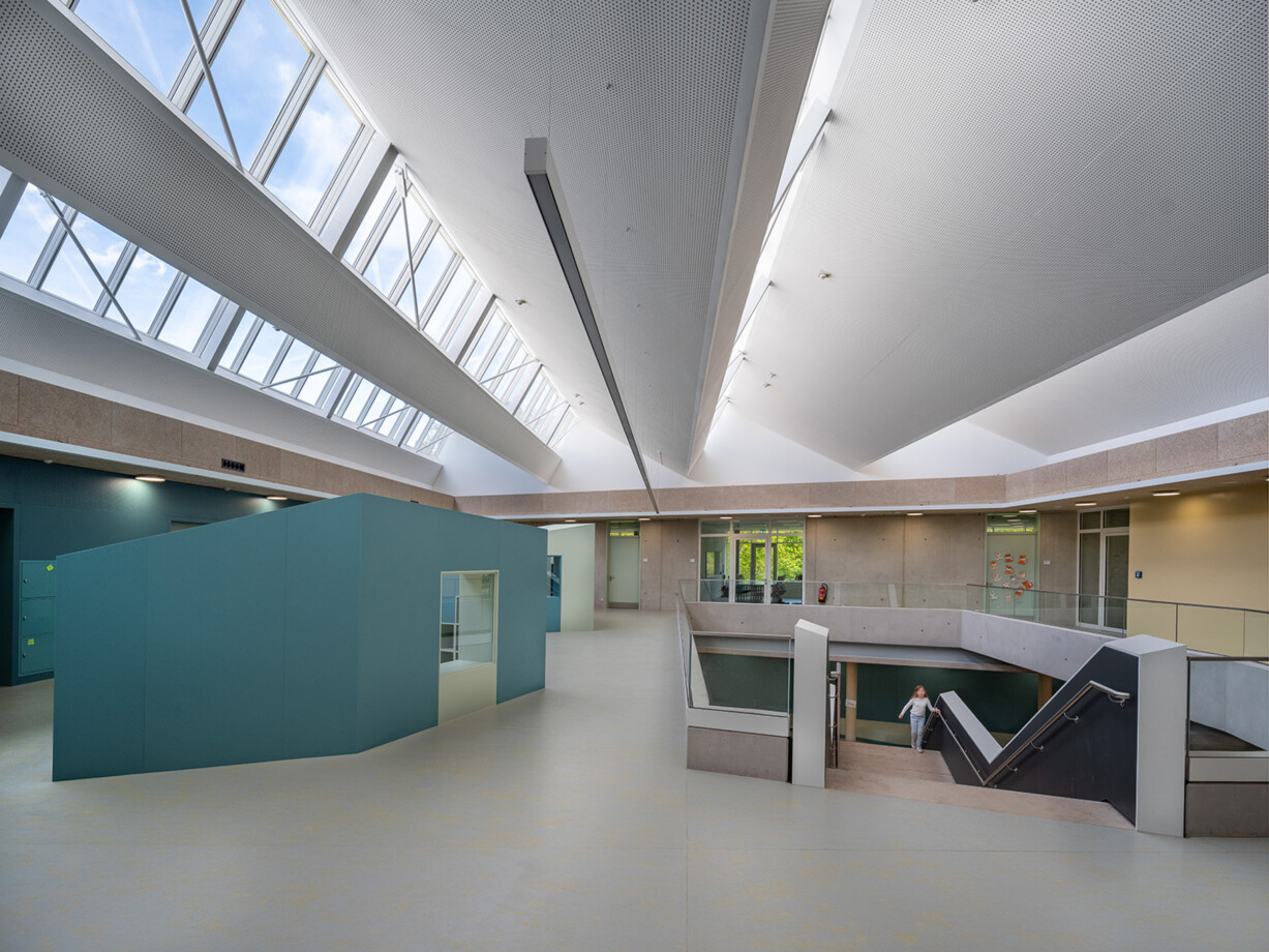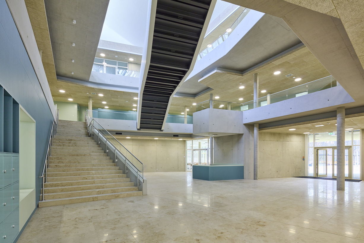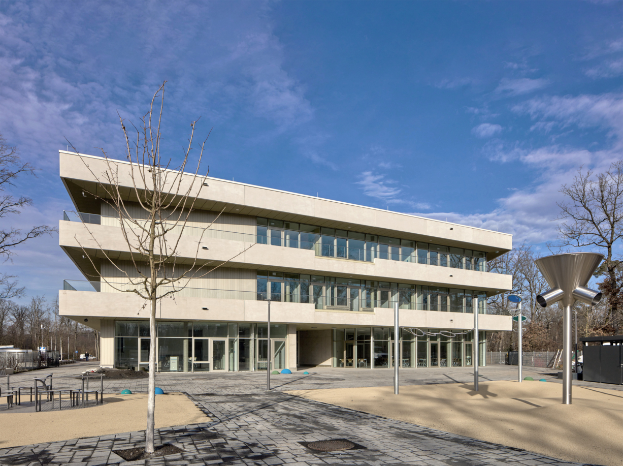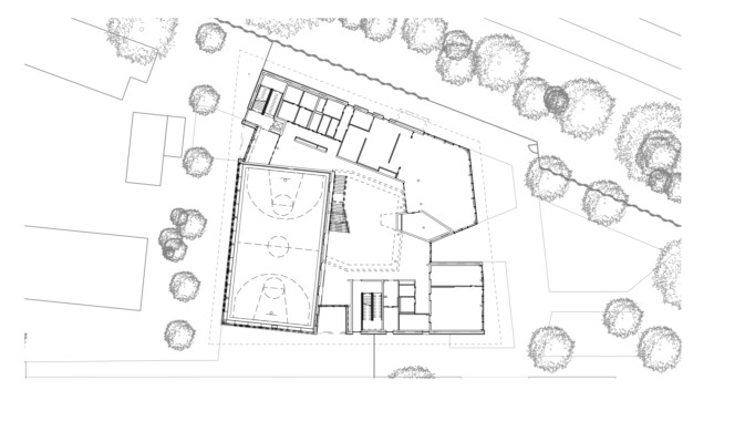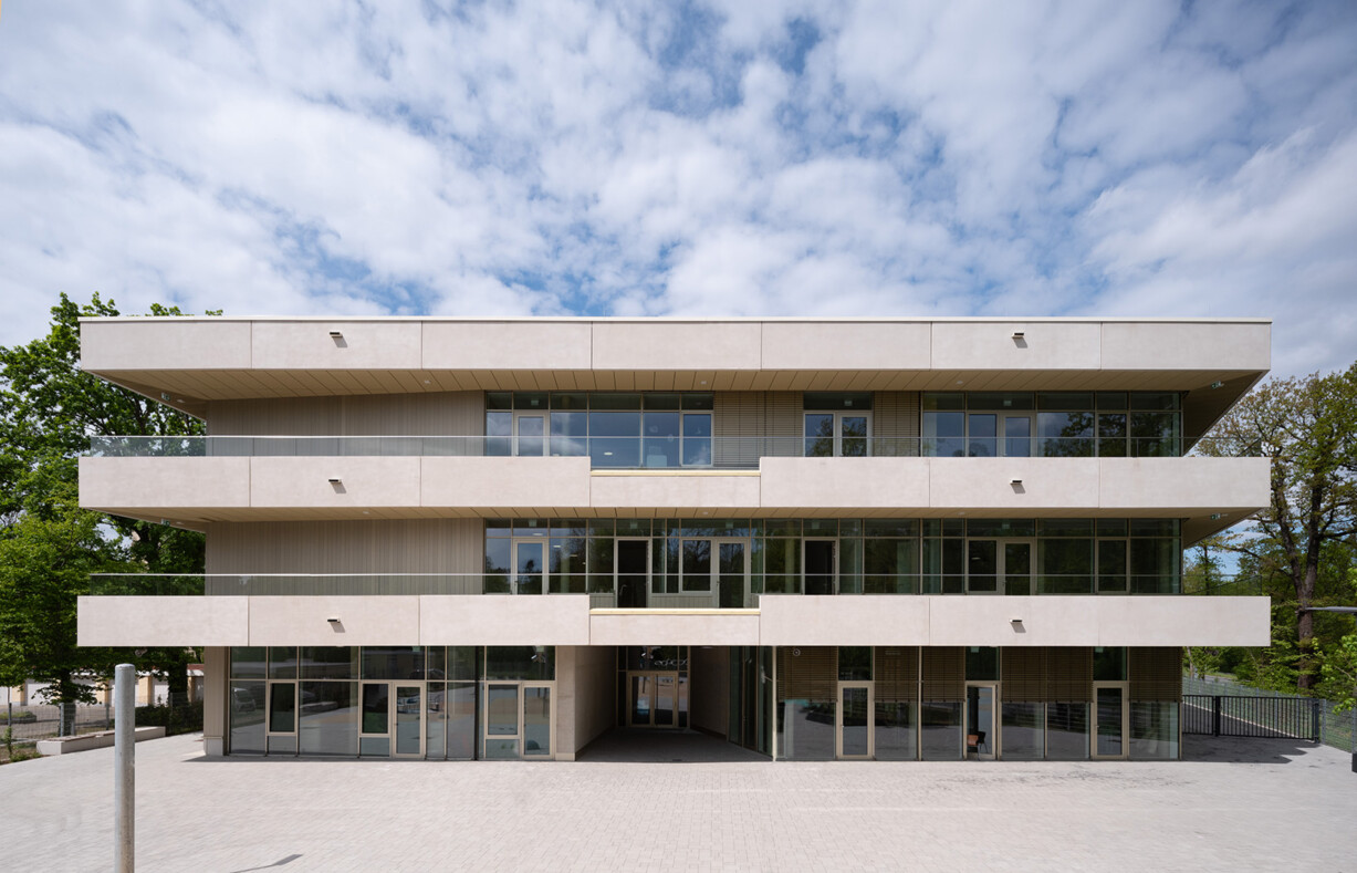 Das Grundstück für die 4. Grundschule Heusenstamm liegt im Norden der Stadt, zwischen der Polizeistation und einem Wohngebiet. Die dreieckige Grundstücksform erfordert einen Sicherheitsabstand von 25 m zur Landesstraße. Ein Parkplatz wird an der Zufahrt vom Frankfurter Weg geschaffen. Der 3-geschossige, teilunterkellerte Baukörper nutzt die Grundstücksform und bietet umlaufende Balkone als zusätzlichen Fluchtweg. Im Erdgeschoss befinden sich die zentrale Eingangshalle, der Speisesaal, die Turnhalle und Räume für die Kooperationsklasse. Im Obergeschoss liegen Betreuungs- und Verwaltungsräume sowie Klassenzimmer. Das Gebäude ist barrierefrei, bietet Platz für 250 SchülerInnen, inklusive Kindern mit Behinderung, und wird als massive Stahlbetonkonstruktion errichtet.