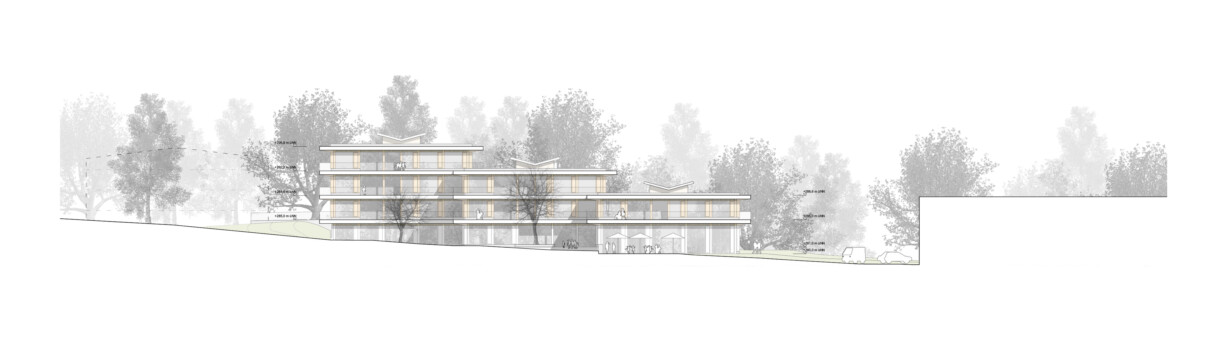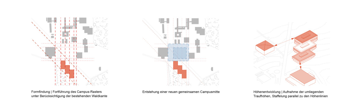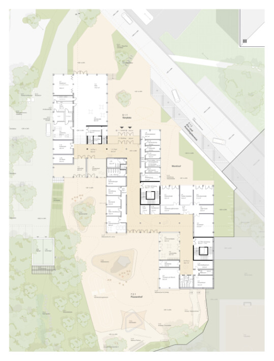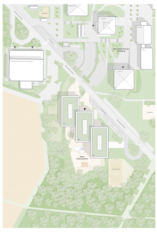 Der Ersatzneubau der Gallusschule bildet den südlichen Abschluss des Schulcampus Grünberg und ist gleichzeitig letzter Baustein hin zum ansteigenden Waldgebiet. Entsprechend der Topografie staffelt sich das Schulgebäude entlang der Struppiusstraße in drei Baukörper mit unterschiedlicher Höhenentwicklung. Der zum Campus zuvorderst liegende Baukörper beinhaltet als Angebot an die Öffentlichkeit, die Aula, die - der Topographie des Geländes folgend - tiefer liegt, und somit eine für diese Nutzung angemessene Raumhöhe erhält, ohne die Erdgeschosszone in Gänze zu überhöhen. Der mittlere Baukörper bildet mit seinem vorgelagerten Platz den Haupteingang der Anlage und erschließt über eine ebenerdige Magistrale die Erdgeschossbereiche der seitlichen Flügel. Endpunkt dieser Magistrale ist der „Waldpausenhof“. Die Aula sowie die Küchenbereiche werden von Nordwesten erschlossen. Als Abholer und Zubringer der Schüler fungiert, die über die gesamte Länge der Struppiusstrasse verlaufende Busparkspur an deren Ende eine Wendeschleife den Abschluss des Schulgeländes darstellt.