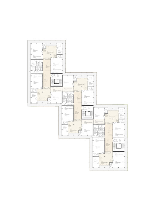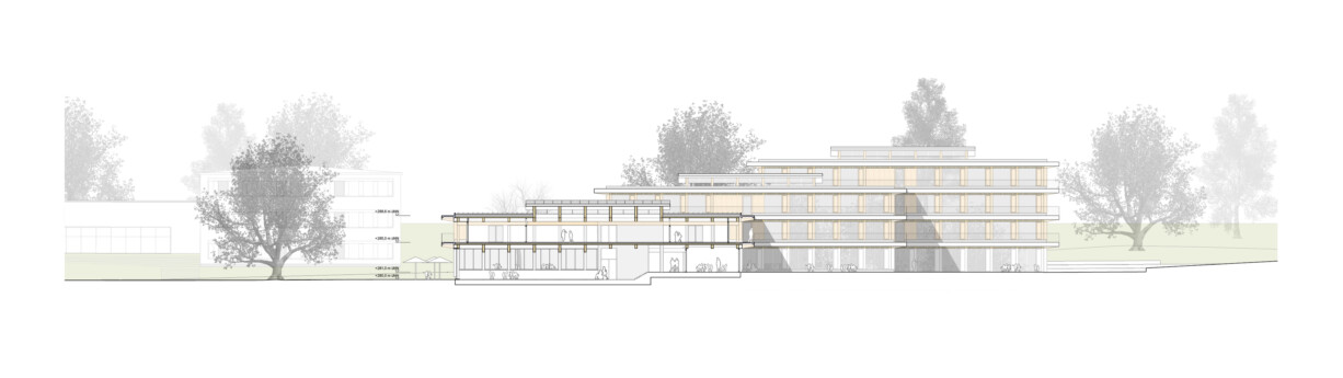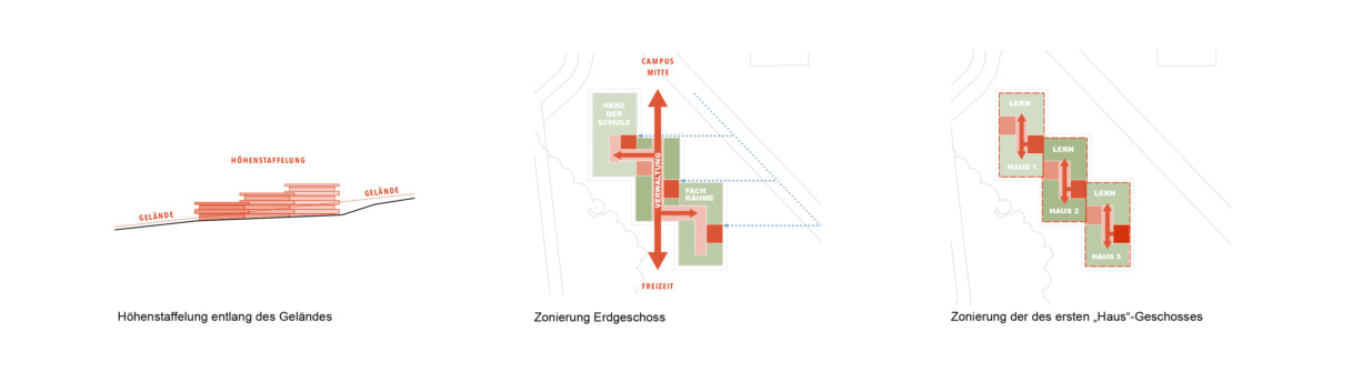 Im zentralen Baukörper erdgeschossig befinden sich die Verwaltungs- und Lehrerbereiche. Im hinteren Baukörper liegen die Fachräume und das Lehrercafé mit Bezug zur Waldkante. Die Lerncluster selbst sind in den Obergeschossen paarweise gekoppelt und jeweils über einen zentralen Verteiler zu erreichen. Neben den zwei Unterrichtsräumen und der zentralen Mitte verfügt jedes Cluster über einen großen loggiaartigen Außenbereich, der als Freiluftunterichts- und Kurzpausenfläche genutzt werden kann und mit den außenliegenden Laubengängen mit den benachbarten Doppelclustern verbunden.