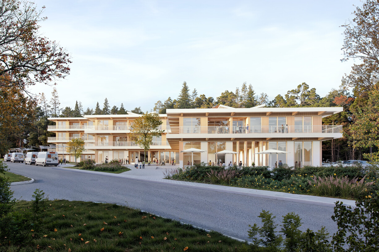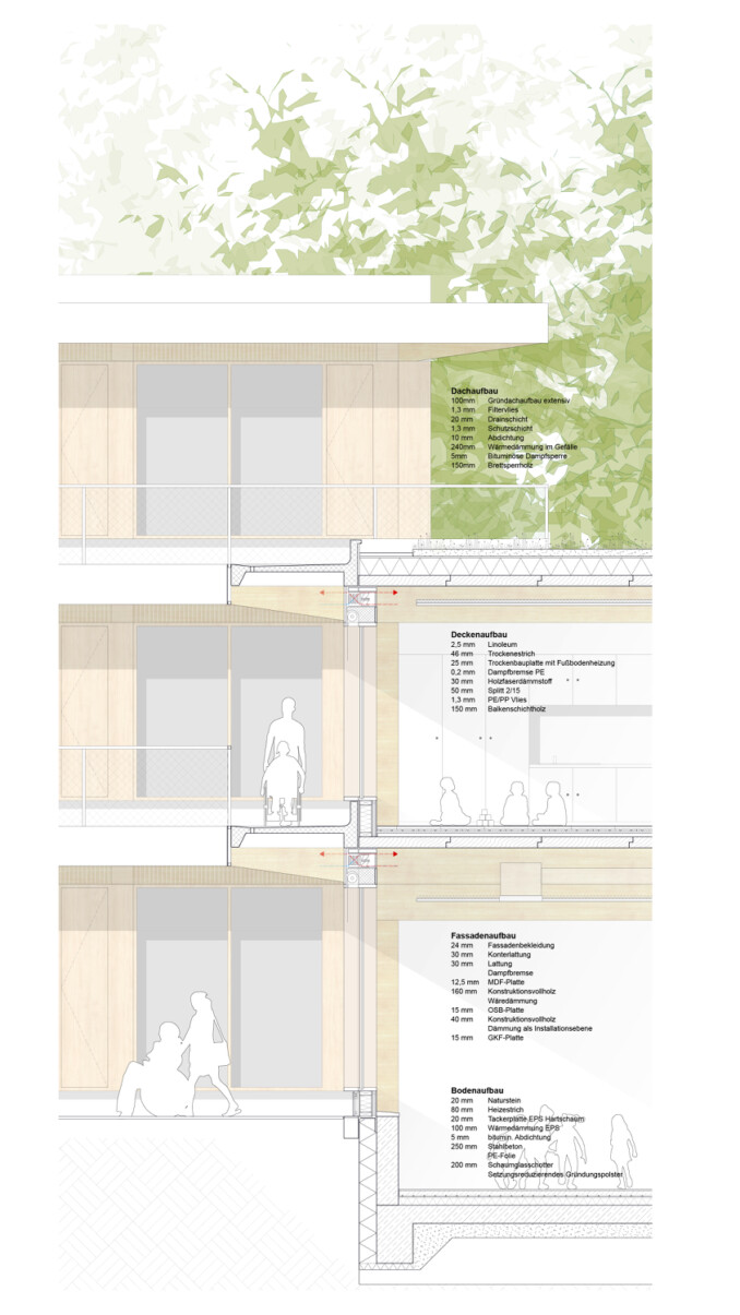Entsprechend des waldnahen Charakters des Grundstücks ist die Architektur durch das Material Holz geprägt. Dabei sorgen die witterungsgeschützten Laubengänge für einen dauerhaften Schutz der Holzfassaden. Die Primärkonstruktion der oberirdischen Baukörper besteht aus einem Skeletttragwerk aus verleimten Holzbindern, fassadenseitig auf Holzständern, flurseitig mittels Querunterzügen gehalten. Darauf bildet eine Brettschichtholzdecke mit Splitschichtauflast und schwimmendem Estrich die aussteifende Geschossdecke. Die Leimholzbinder kragen fassadenseitig aus und tragen eine faserbewehrte Betonschalenplatte, die sowohl den Brandschutz der Fluchtbalkone als auch den Witterungsschutz der außenliegenden Holz-und Fassadenkonstruktion gewährleistet. Die Absturzsicherung der Balkone erfolgt über ein mit Maschengewebe gefülltes Geländer, dass den Schülern zusammen mit der niedrigen Brüstung der Fenster auch im Sitzen den Ausblick in die Umgebung gewährt. Die Dächer sind intensiv begrünt, um den naturnahen Charakter des Gebäudes zu unterstreichen, gleichzeitig zur Rückhaltung des Niederschlagswassers und als Hitzeschild gegen Sonneneinstrahlung.