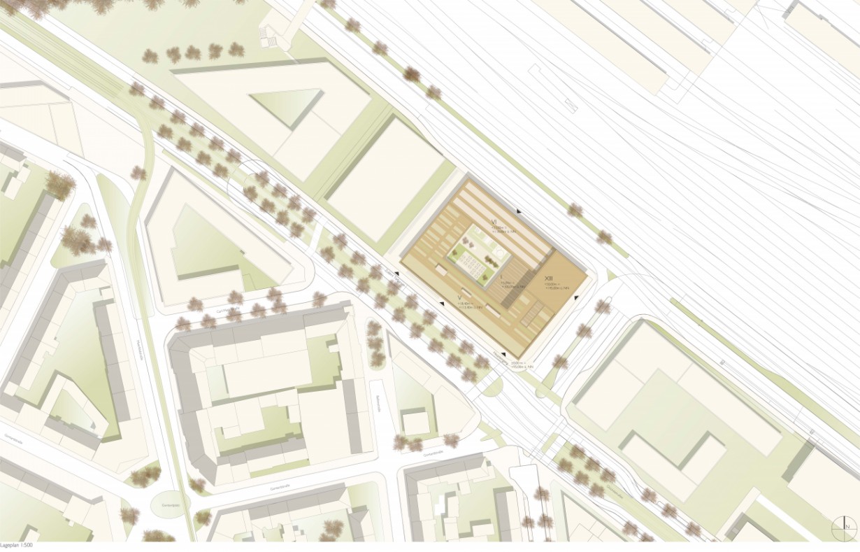zugehörigem Wartebereich. Die zurückversetzte Erdgeschossfassade verbreitert den Bür-gersteig und verbindet die überdeckten, ebenerdigen Fahrradstellplätze für Mitarbeiter