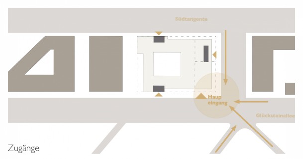 Die Erschließung für Mitarbeiter und Besucher erfolgt von der Glücksteinallee aus, hier liegt auch der Hauptzugang mit Empfang als zentraler Anlauf- und Informationspunkt mit
